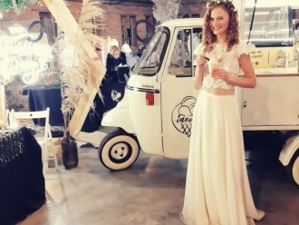 Włoskie odrestaurowane Piaggio Ape 501 z lodami rzemieślniczymi. Idealne rozwiązanie na eleganckie wesele.