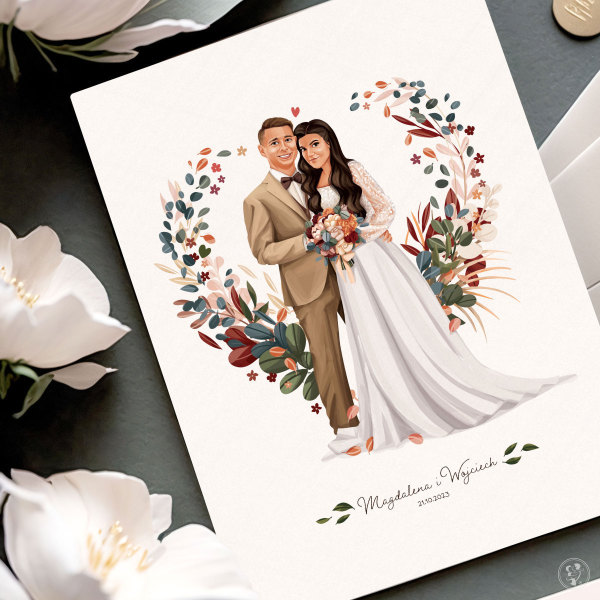Czym wyróżnia się nasza oferta?Zarówno rodzice jak i Para młoda, narysowani są tak samo jak wyglądają w dniu wesela. Ubiór, fryzury a nawet biżuteria, są to elementy o których zdjęcia proszę jeszcze przed tworzeniem ilustracji. Następnie nanoszę na rysunek. Tworzy to niesamowity efekt wow dla rodziców jak i wszystkich gości weselnych. Ponad to elementy w tle tj kwiatowy wianuszek jest dostosowany do motywu przewodniego wesela więc wszystko ładnie ze sobą współgra.