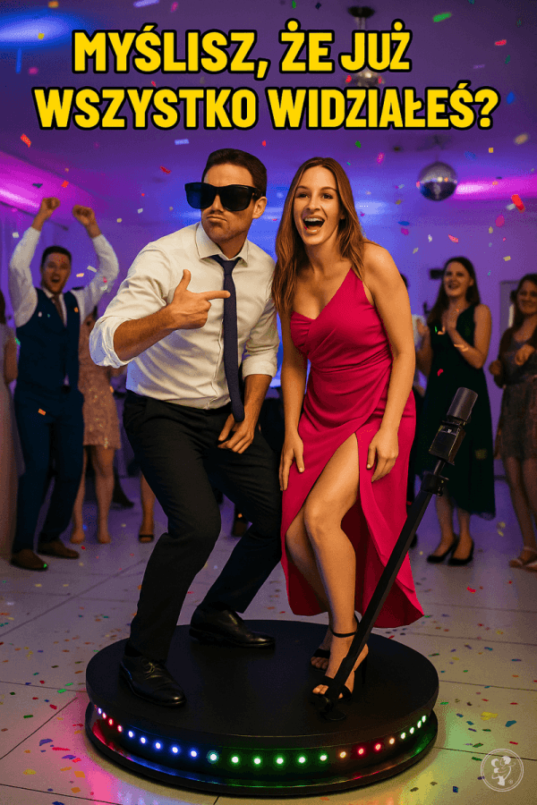 To hit każdej imprezy! Uczestnicy stają na eleganckiej platformie, a kamera w jakości 4K (iPhone 15 Pro) obraca się wokół nich, tworząc spektakularne, dynamiczne wideo.