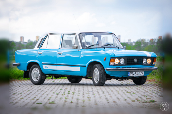 Błękitny Fiat 125p jest doskonały na ślubną podróż.