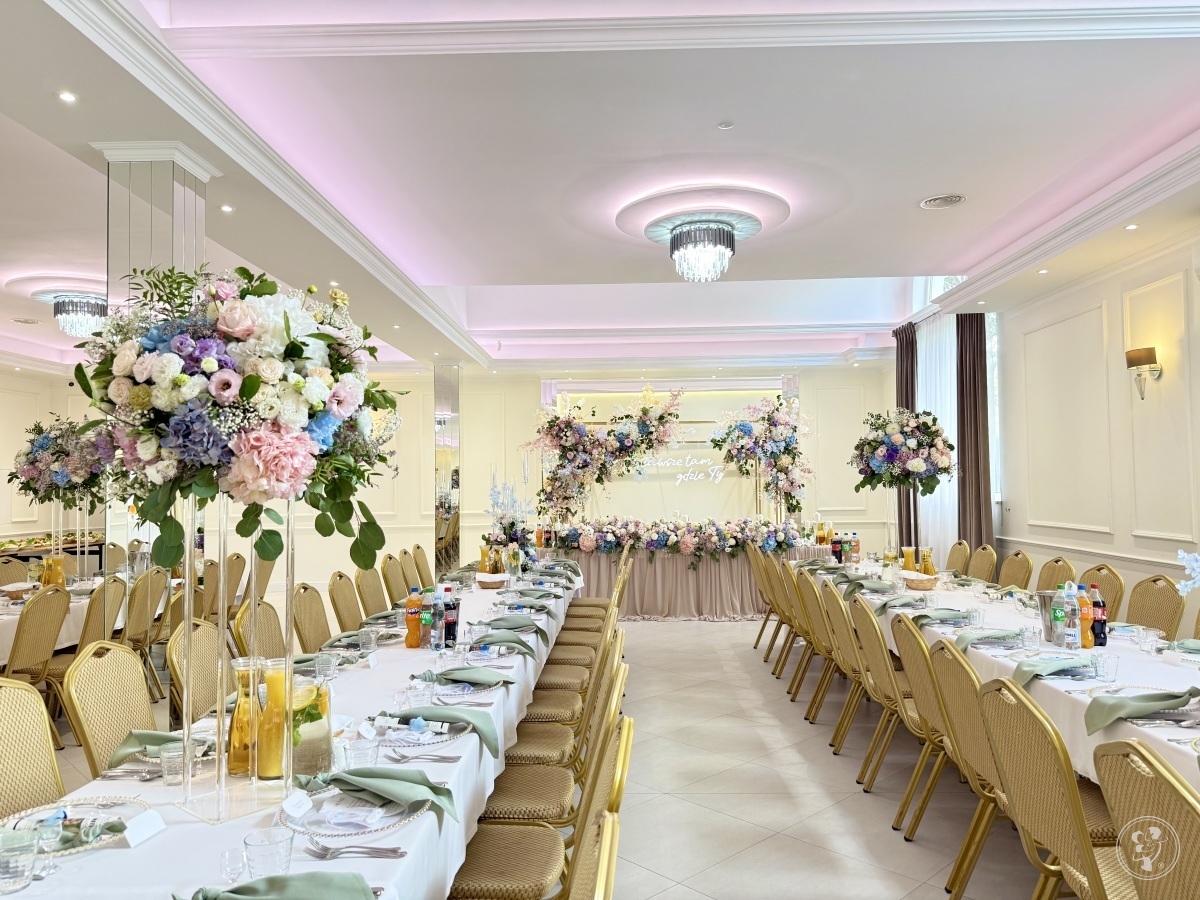 Sala bankietowa, którą oddajemy do Waszej dyspozycji stanowi połączenie nowoczesności i klasycznej elegancji, które doskonale podkreślą charakter każdego organizowanego przyjęcia. Jasna, ciepła kolorystyka z pięknymi akcentami w postaci kryształowych żyrandoli oraz luster tworzy wymarzone tło do celebrowania najważniejszego dnia w Waszym życiu. Ponadto sala wyposażona została w klimatyzację, nowoczesny system oświetleniowy i multimedialny.