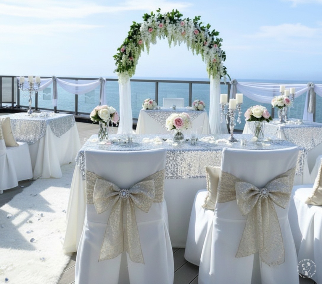 Dominują biele, pastele i srebrne akcenty, które tworzą bardzo elegancką, czystą i ponadczasową przestrzeń. To styl, który doskonale pasuje zarówno do klasycznych, jak i nowoczesnych wesel.