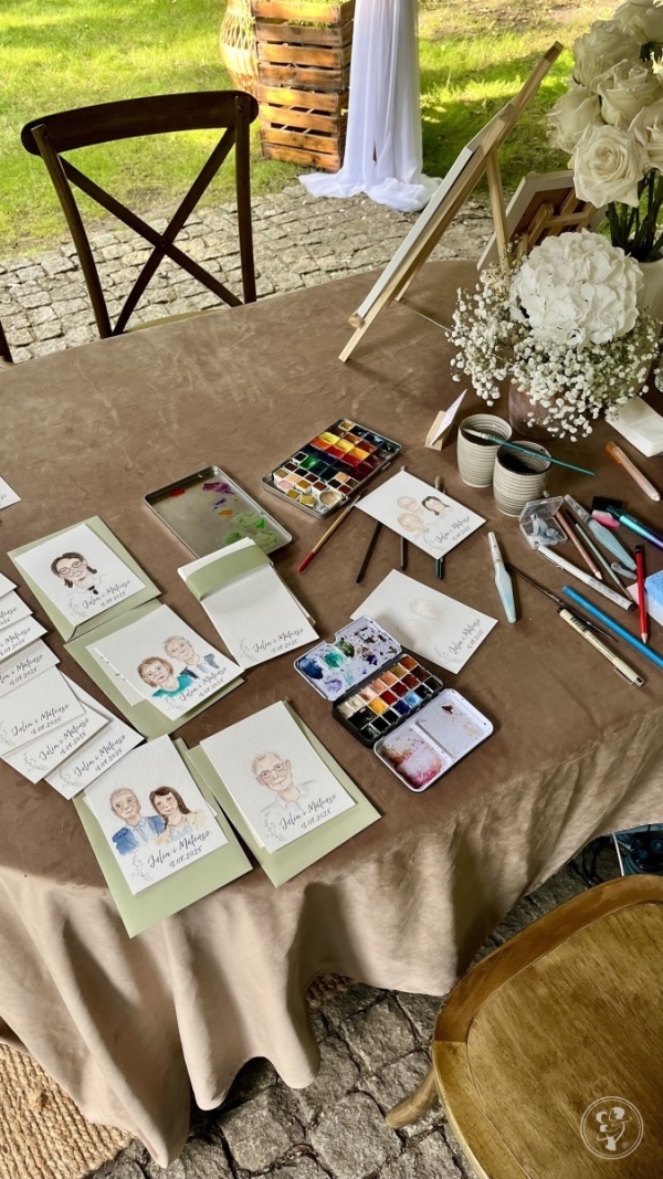- Portrety dla Gości: Ręcznie malowane akwarelą, na personalizowanym papierze.