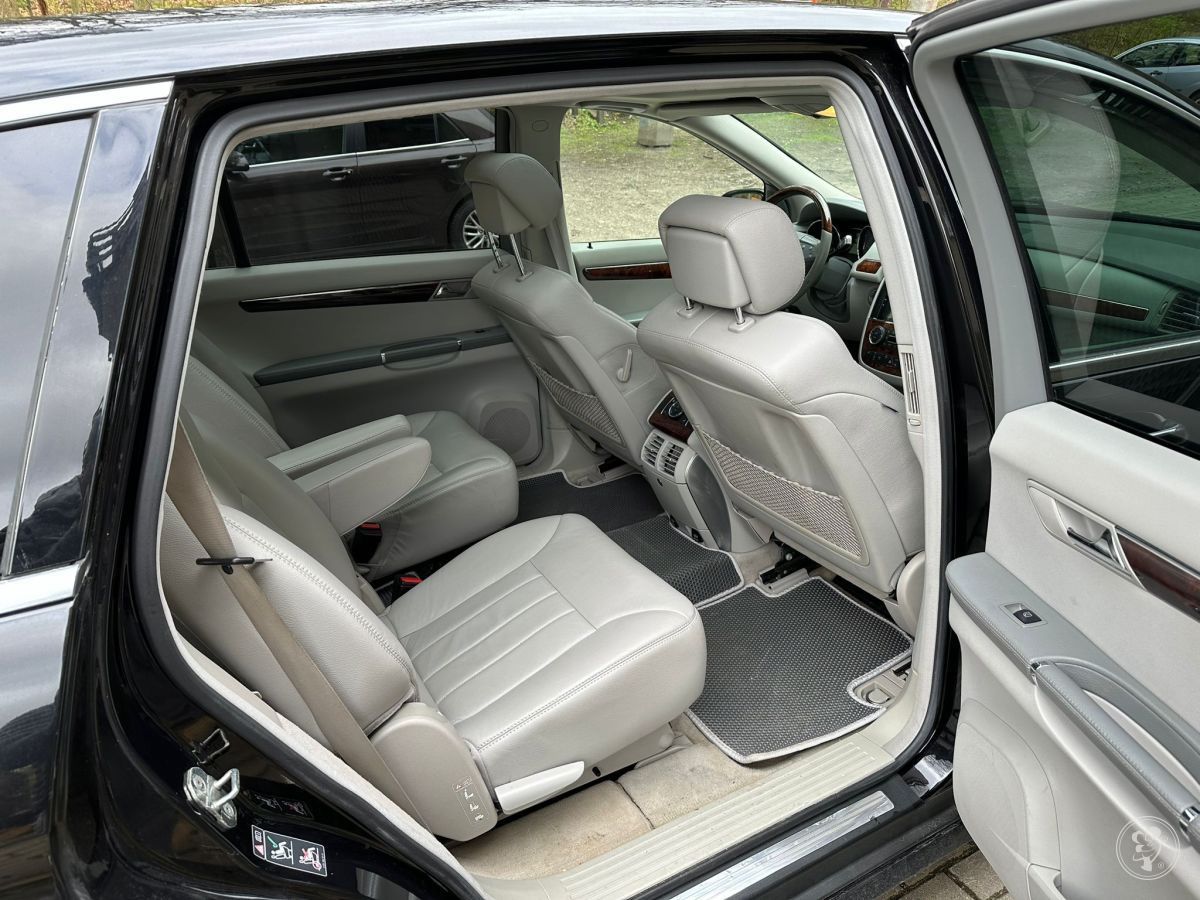 mamy zaszczyt zaproponować Państwu wynajęcie ekskluzywnego samochodu Mercedes klasy R ( kierowca + 5 osób ) w kolorze granatowym wraz z kierowcą. Mercedes klasy R to wyjątkowo elegancki i luksusowy pojazd, który przyciąga uwagę oraz na pewno uświetni każdą uroczystość ślubną. Mercedes klasy R to połączenie limuzyny i SUV-a, a więc luksusu i wspaniałych właściwości jezdnych. Mercedes klasy R gwarantuje Państwu dużą przestrzeń, tak bardzo potrzebną w szczególności dla Panny Młodej. Skórzana tapicerka, duże komfortowe fotele, jakich nie oferują inne limuzyny, wysokiej jakości sprzęt Audio/DVD, nawigacja satelitarna, zawieszenie Airmatic i trzy strefowa klimatyzacja pozwolą Państwu na pełen relaks, a pragnienie ugasi bogata oferta napojów, która znajduje się na wyposażeniu auta.