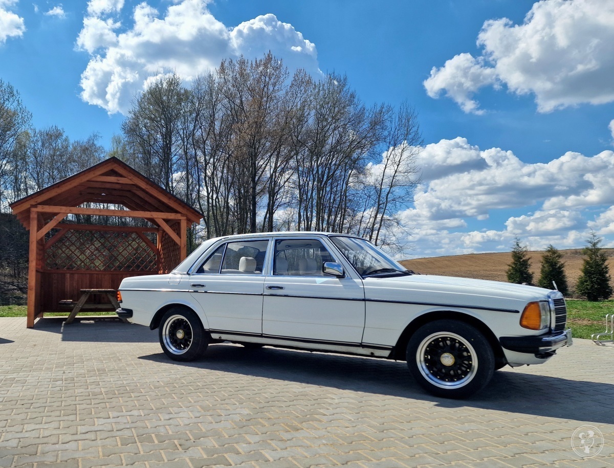 Oferuję wynajem zabytkowego Mercedesa W123 sedan z 1978 roku w kolorze białym, z eleganckim, białym skórzanym wnętrzem.