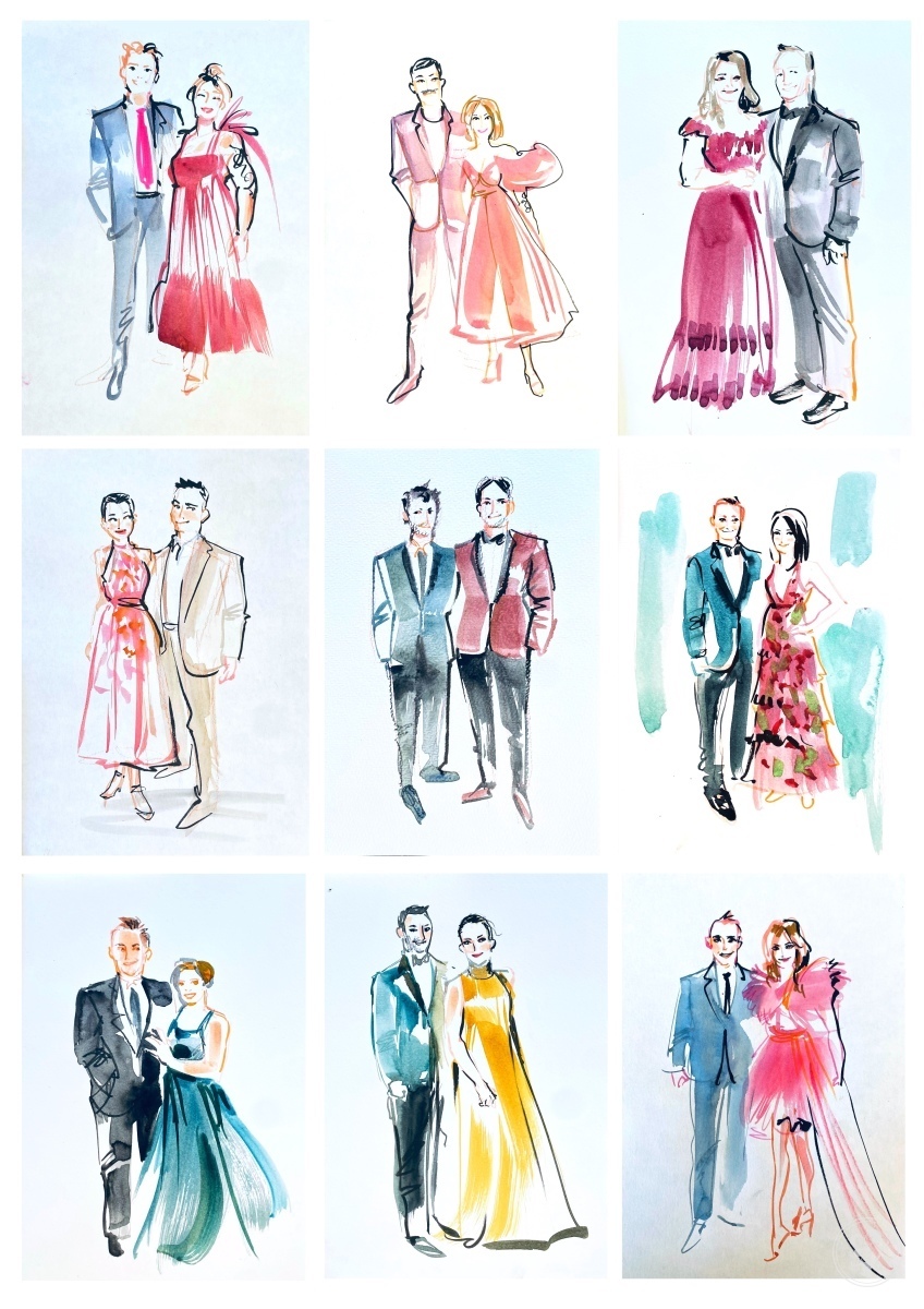 Tworzę portrety w duchu żurnalowej ilustracji, niezwykle eleganckie pamiątki weselne, które sprawią że Wasi Goście poczują się docenieni i wyjątkowi. Czuję się komfortowo z publicznością, lubię rozmawiać podczas mojej pracy; każdy portret powstaje na oczach gości, w około 6-9 minut.