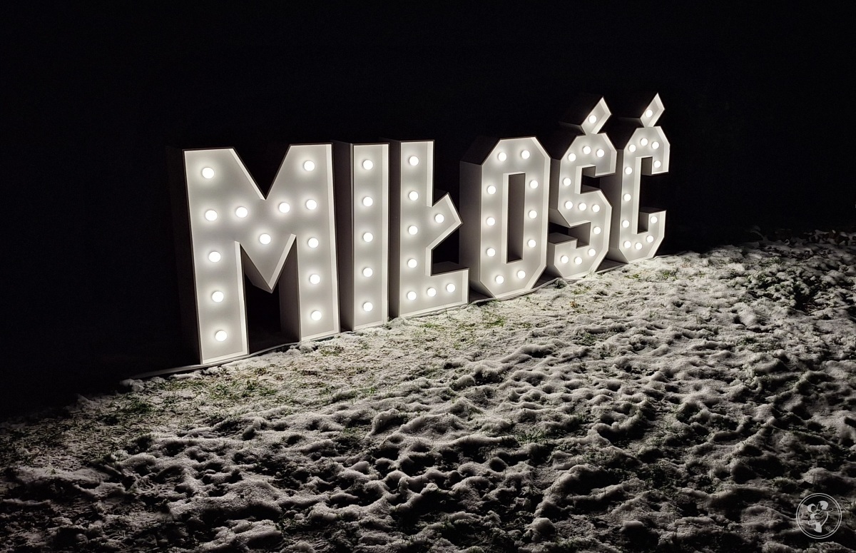 - napis LOVE, o wymiarach około: 100 cm wysokości, całość około 350 cm szerokości. Napis ten sterowany jest za pomocą pilota - ma możliwość zmiany koloru podświetlenia i dostosowania do Waszych oczekiwań.