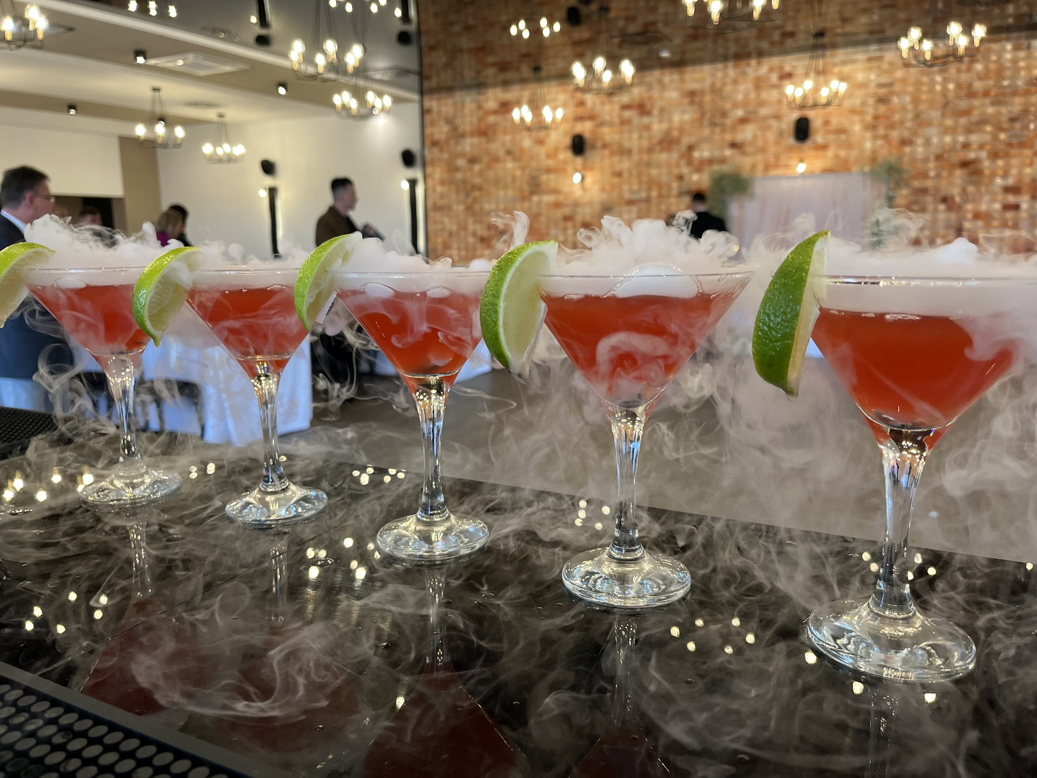 - produkty niezbędne do wykonywania koktajli – alkohole, owoce, soki, lód, syropy barmańskie, puree, bittersy, dekoracje oraz ❗️ suchy lód ❗️