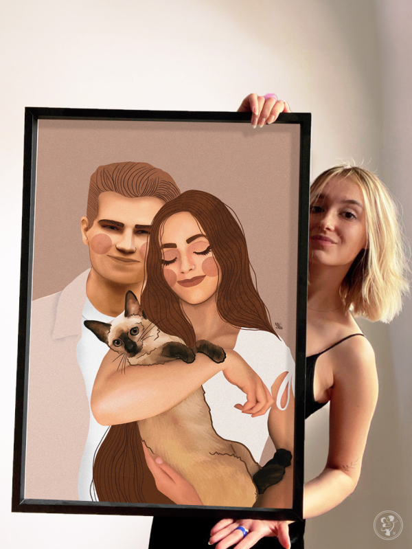 w tworzeniu portretów. W 2021r. pędzel malarski zamieniłam na piórko tabletu graficznego. Zaczęłam tworzyć portrety w technice cyfrowej. Ta technika pozwala mi wprowadzać zmiany bez konieczności tworzenia portretu od nowa, co oszczędza mój czas oraz jest wygodne dla moich klientów. Każdy portret zaczynam od szkicu, poprzez wybór kolorów i nadanie charakterystycznych dla mojego stylu elementów. Bardzo lubię tworzyć w ciepłej, cynamonowej palecie kolorystycznej, żeby podkreślić ciepło i uczucie pomiędzy portretowanymi osobami. Tworzę w dwóch wypracowanych przeze mnie stylach: romantycznym oraz linearnym- Zerknij na realizacje i wybierz styl, który najbardziej do Ciebie przemawia!