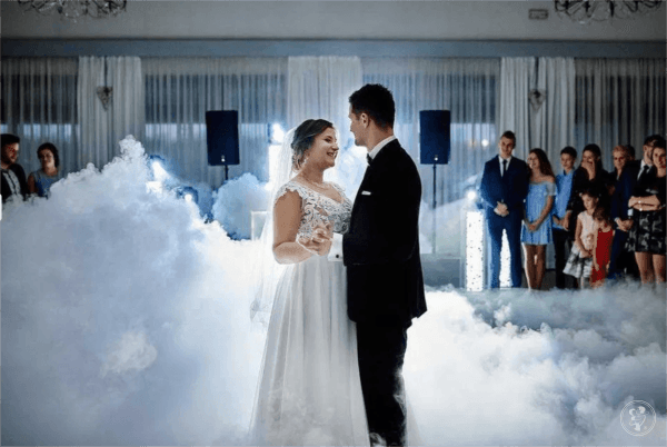 Po parkiecie unoszą się prawdziwe kłęby gęstego, śnieżnobiałego dymu, które pozostają nisko przy podłodze, nie zasłaniając twarzy i nie przeszkadzając gościom. Całość prezentuje się niezwykle efektownie na żywo oraz na zdjęciach i filmach 📸🎥
