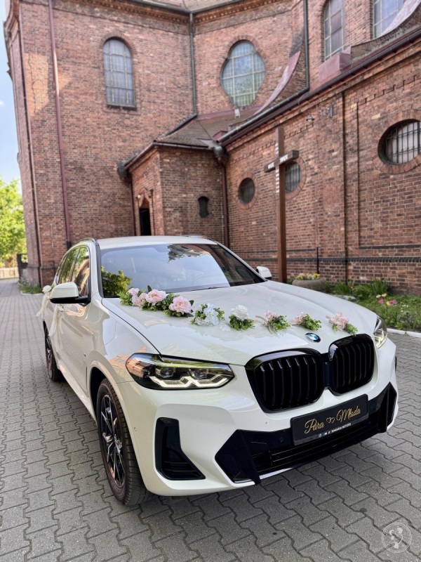 Oferujemy wynajem samochodu do ślubu BMW X3 M-pakiet w białym kolorze z czarnymi dodatkami doskonale podkreślający atmosferę uroczystości ślubnej.