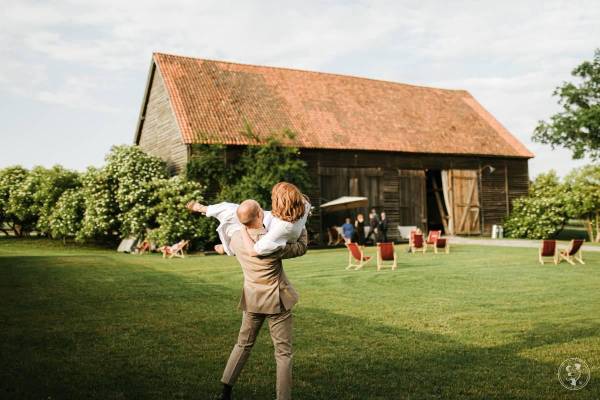 Drewniana stodoła otoczona przez zieleń ogrodu daje możliwość organizacji obiadu poślubnego, kameralnego wesela, poprawin, ślubu w plenerze.