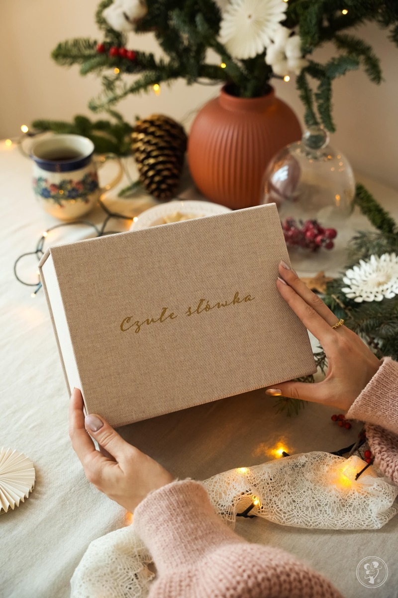 Czym wyróżnia się nasza oferta?Przede wszystkim połączeniem estetyki premium z doświadczeniem emocjonalnym. Lniane pudełko zastępuje klasyczną księgę gości, stając się eleganckim elementem weselnej aranżacji i jednocześnie pamiątką na lata. Ręcznie malowane karty z akwarelowym motywem kwiatów nadają całości unikalny, artystyczny charakter — nie ma tu masowej produkcji ani przypadkowości.