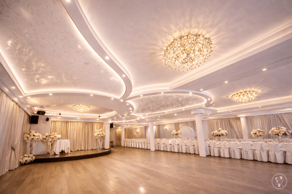 W naszej willi znajduje się elegancka sala weselna zaaranżowana w nowoczesnym stylu. Ta może pomieścić do 120 osób. Jej wnętrze zostało zaprojektowane z dbałością o każdy detal. Tym, co je wyróżnia jest podświetlany, napinany sufit w kształcie motyla. W sali panuje jasna kolorystyka. Jej dodatkowym atutem jest dostęp do naturalnego światła. Znajdują się tu przestronny, antypoślizgowy parkiet oraz podest dla zespołu, gdzie istnieje możliwość podłączenia oświetlenia i instrumentów.